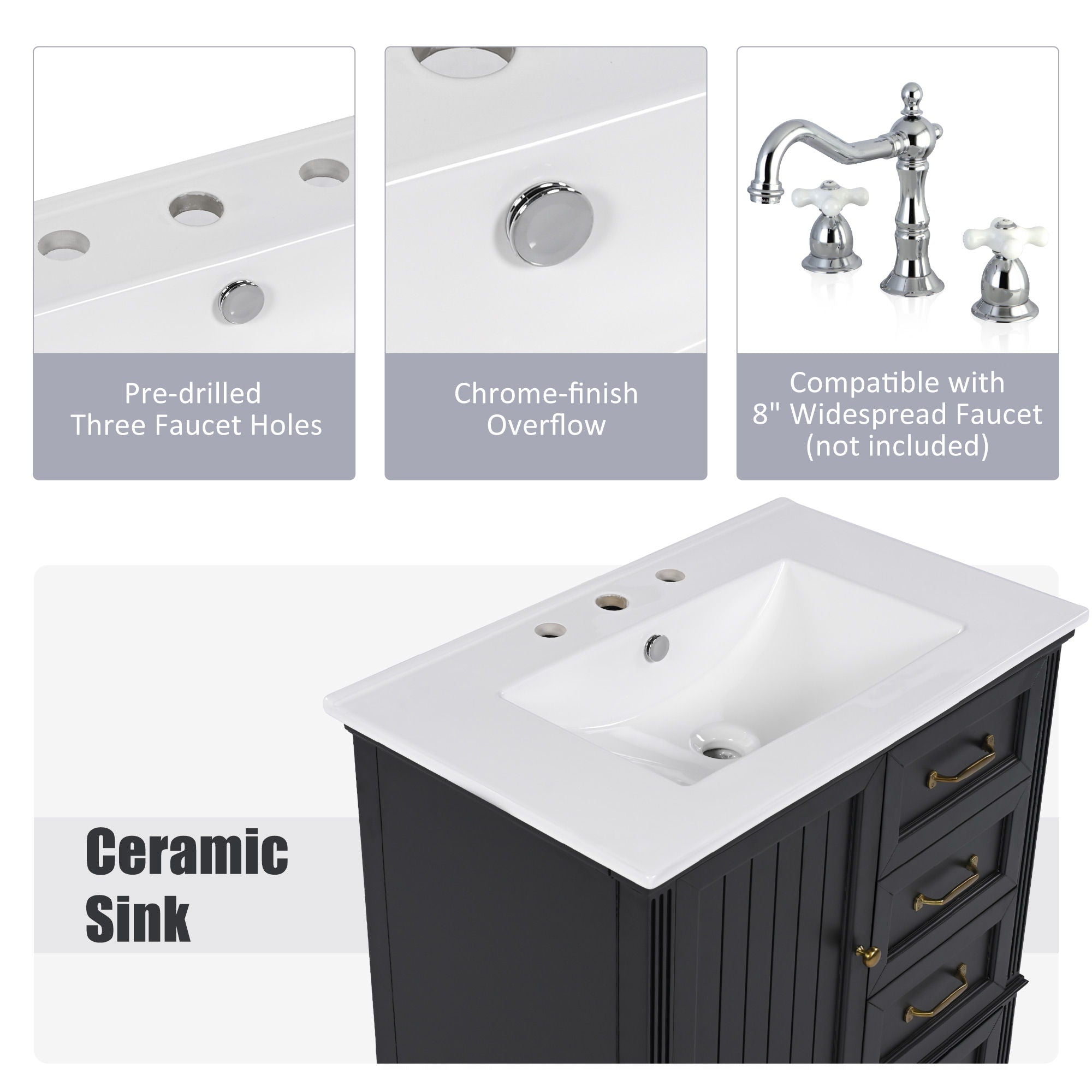30" Bathroom Vanity With Sink, 3 Drawers, Adjustable Feet