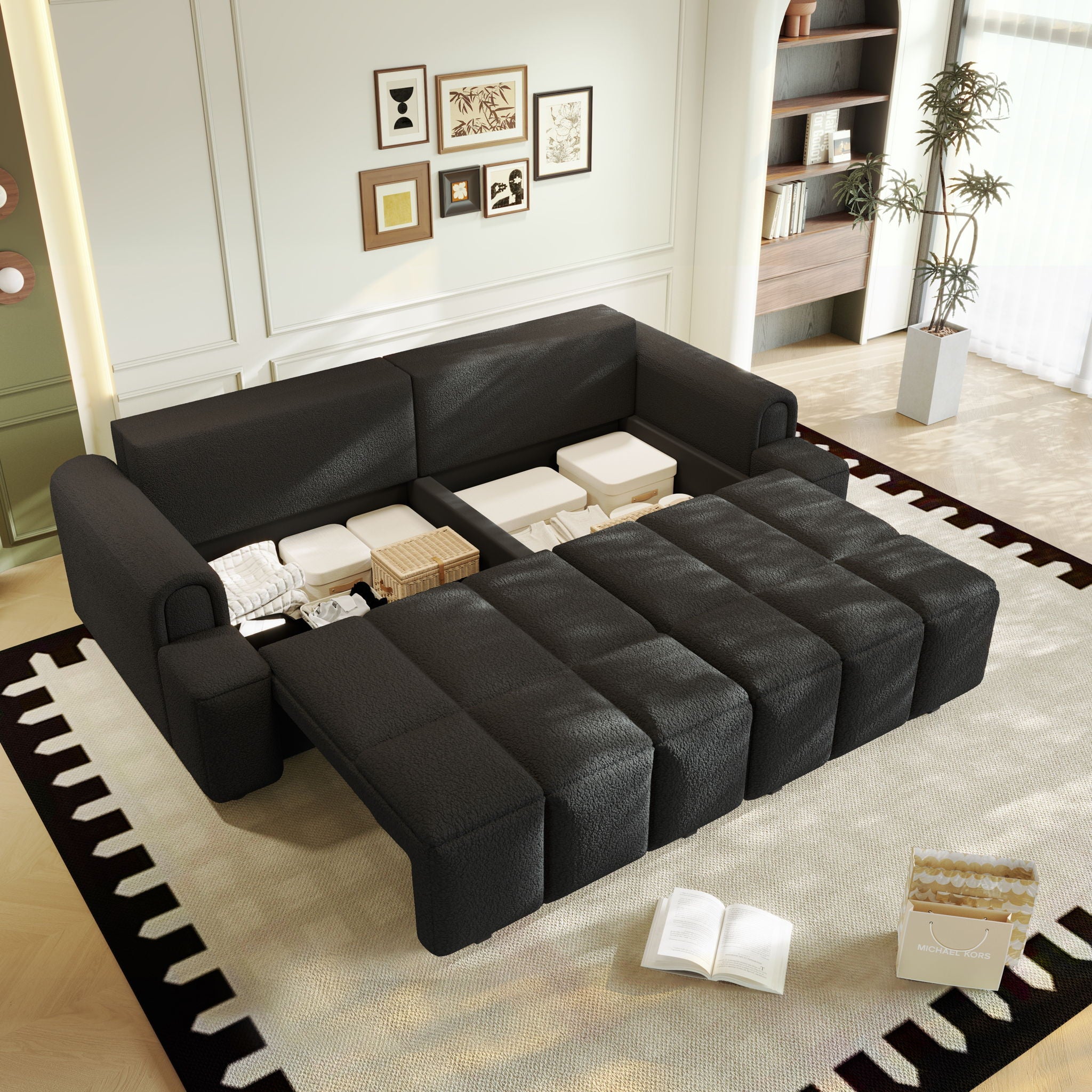4 Seater Couch & Seats Storage, King Size 3 In 1 Convertible Sleeper Sofa Bed For Living Room - Black90.2"W x 40.6"D x 38.2"H - 191.79 lb