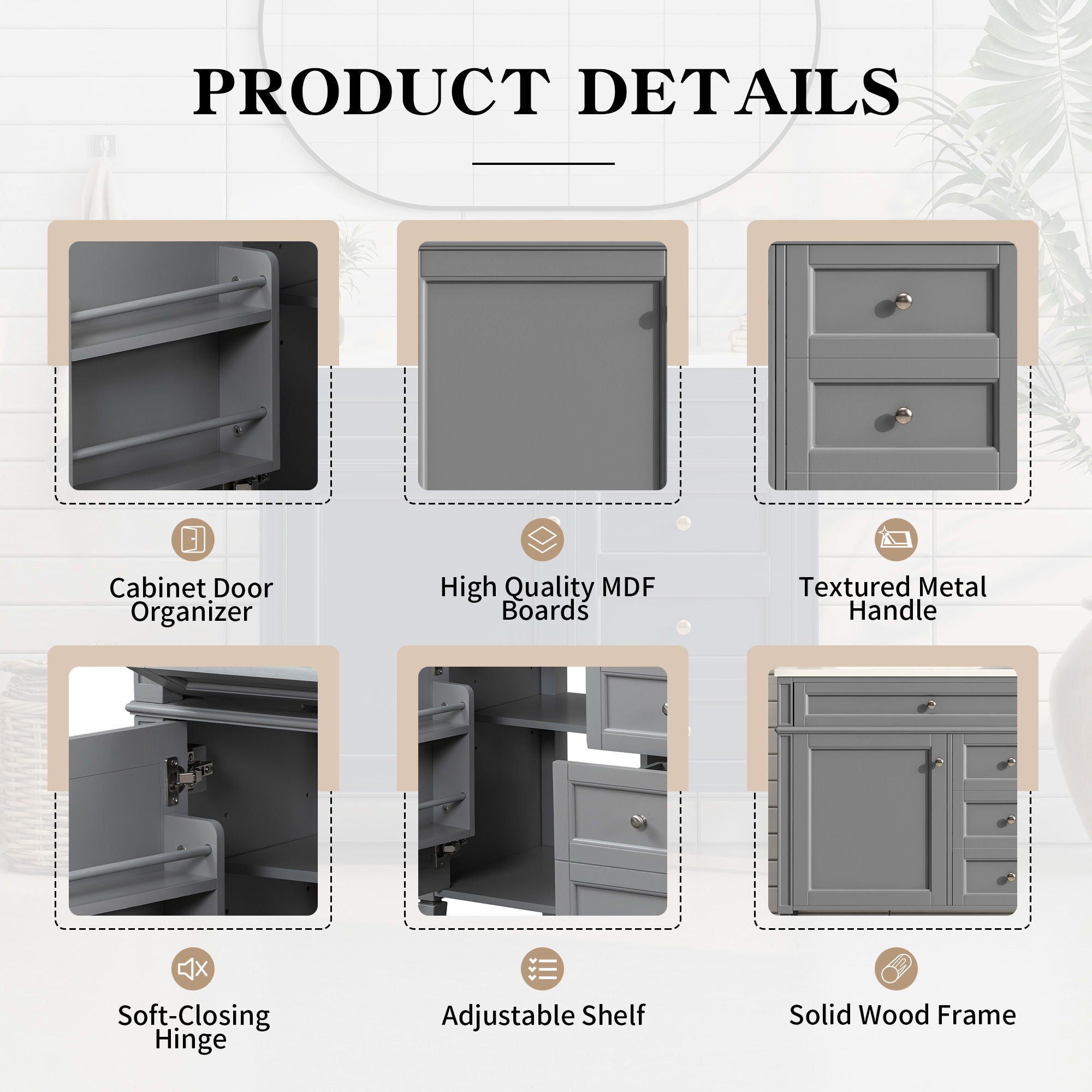 Multi-Purpose Design: The vanity provides ample storage for toiletries and bathroom essentials, combining cabinet space and drawers to keep items protected from water and dust. Soft-close doors and water-resistant paint ensure durability and functionality.