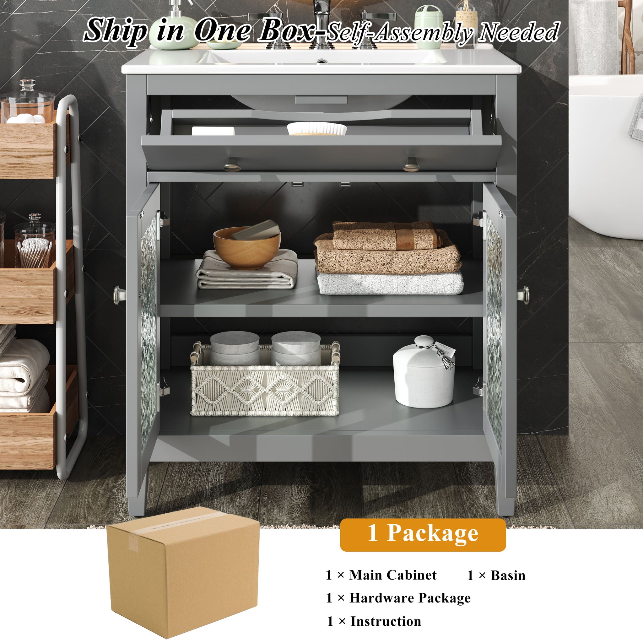 Bathroom Vanity With Sink, Adjustable Shelf & Tip Out Tray - Gray30.0"W x 18.43"D x 34.05"H - 83.77 lb
