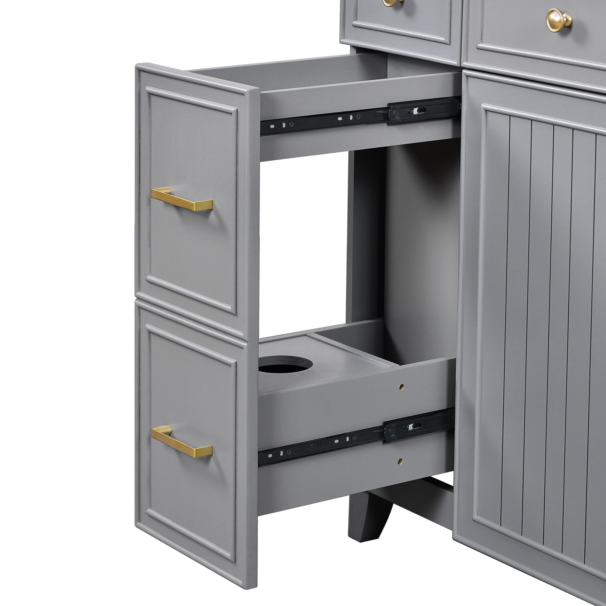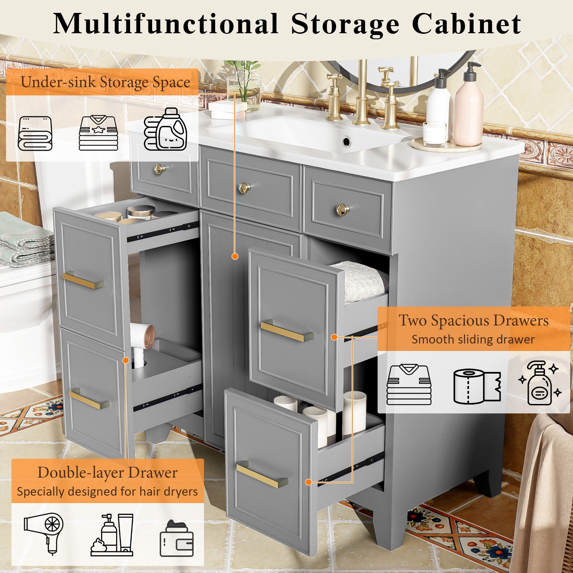 - Ample & Versatile Storage: Features a dual-drawer designone side holds hair tools and toiletries, the other stores towels neatly. The center cabinet offers extra room for cleaning supplies.