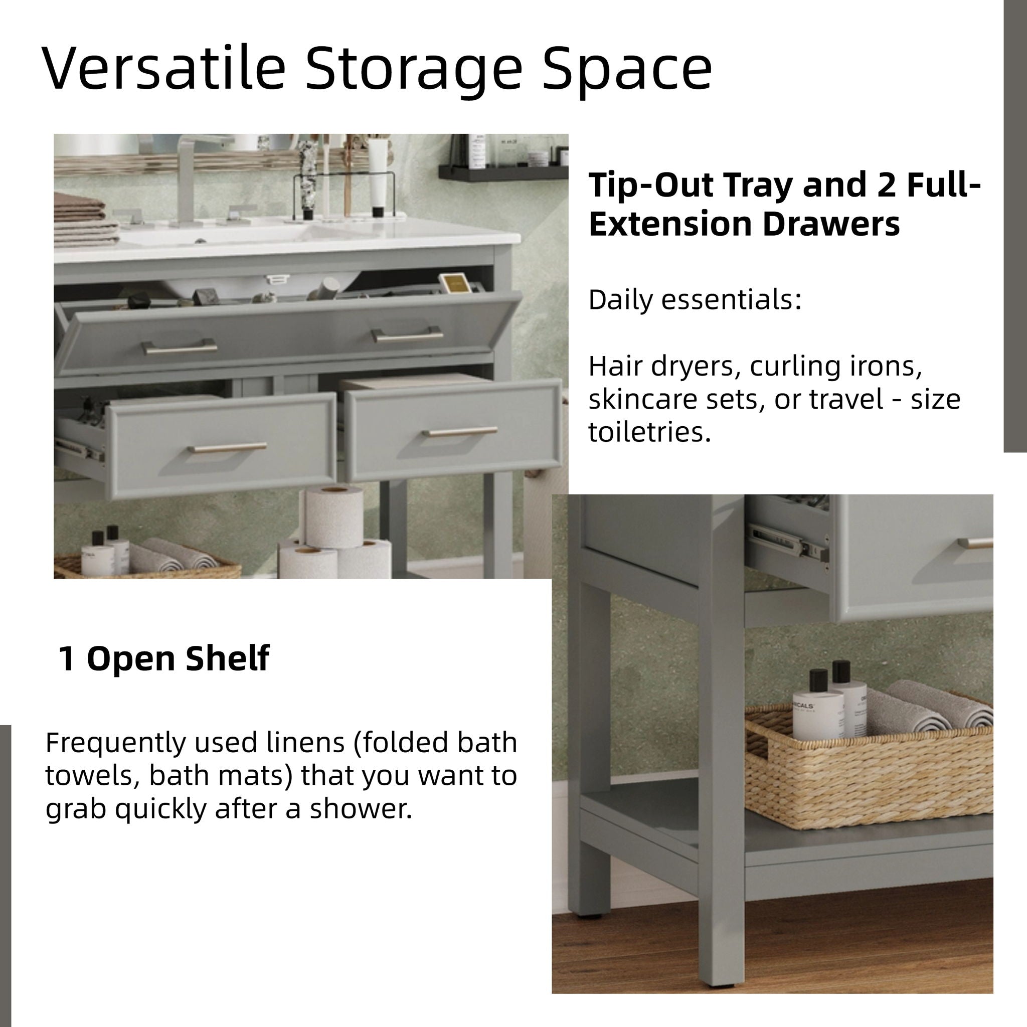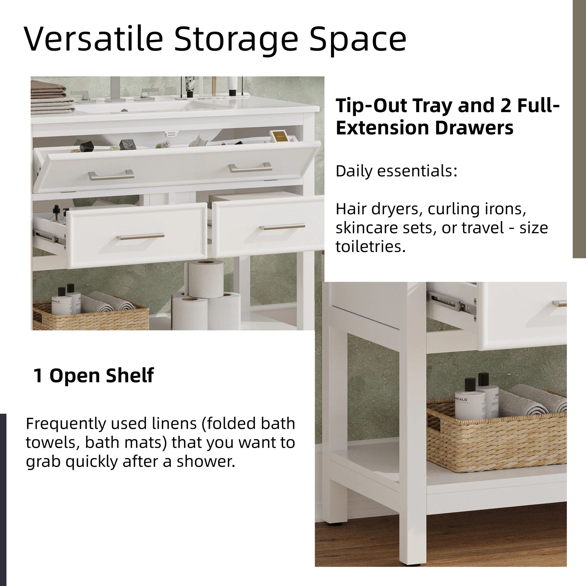- Smart Storage Layout: Combines a tip-out tray, two full-extension drawers, and an open bottom shelf for organized access to daily essentials and decorative items.