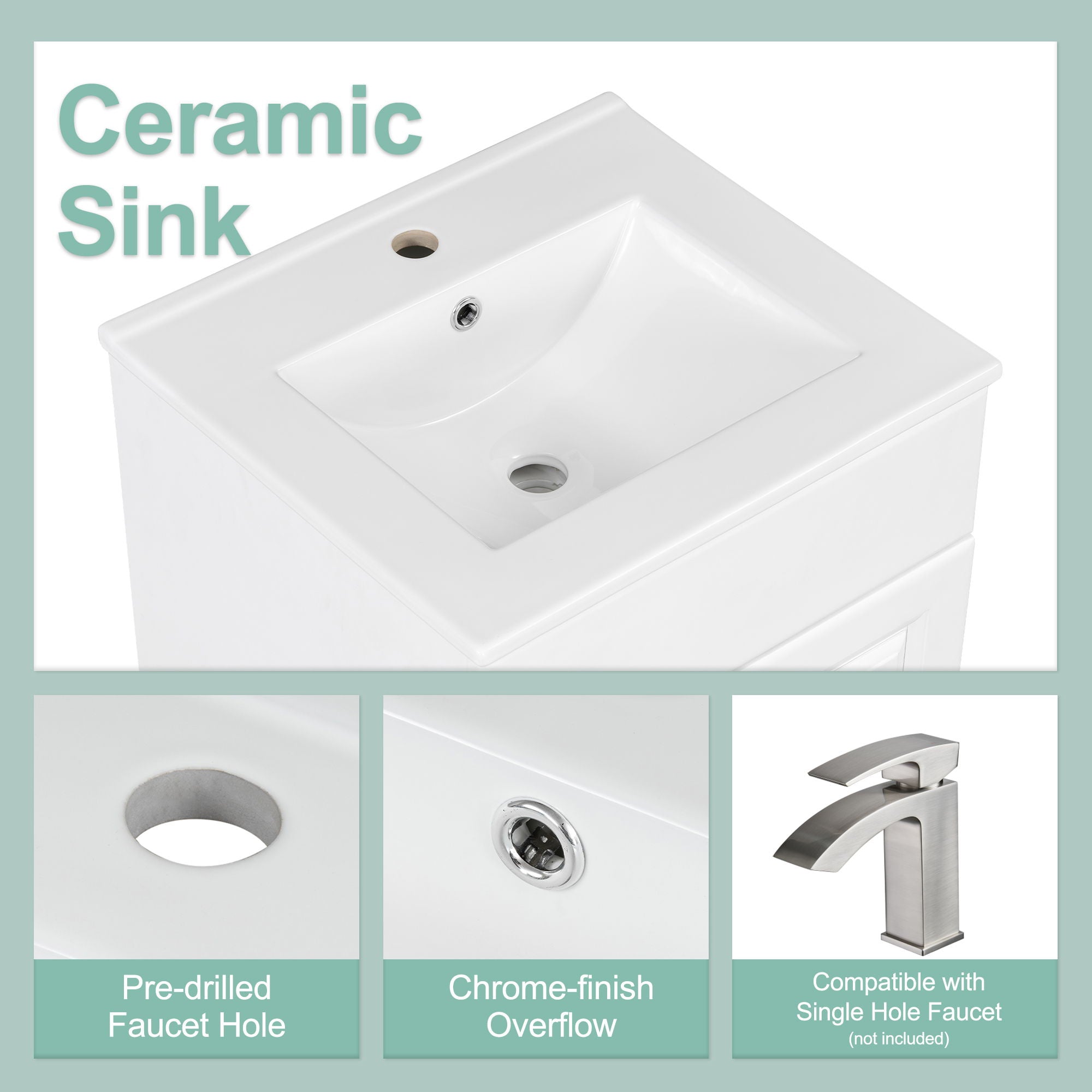 - Ceramic Sink: Designed with a smooth, water-proof ceramic finish, the sink is resistant to water stains and features a pre-drilled hole on the top which is available to single hole faucet (not included)