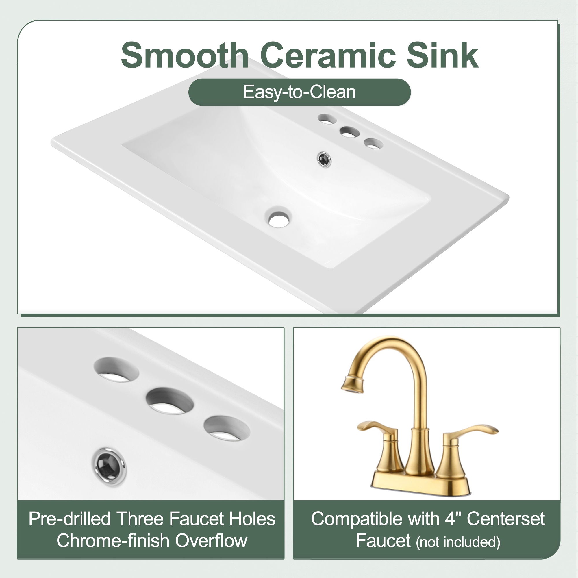 • Ceramic Sink: Easy-to-clean sink with water stain resistance, pre-drilled for 4" widespread faucets (not included) and features a -finish overflow.