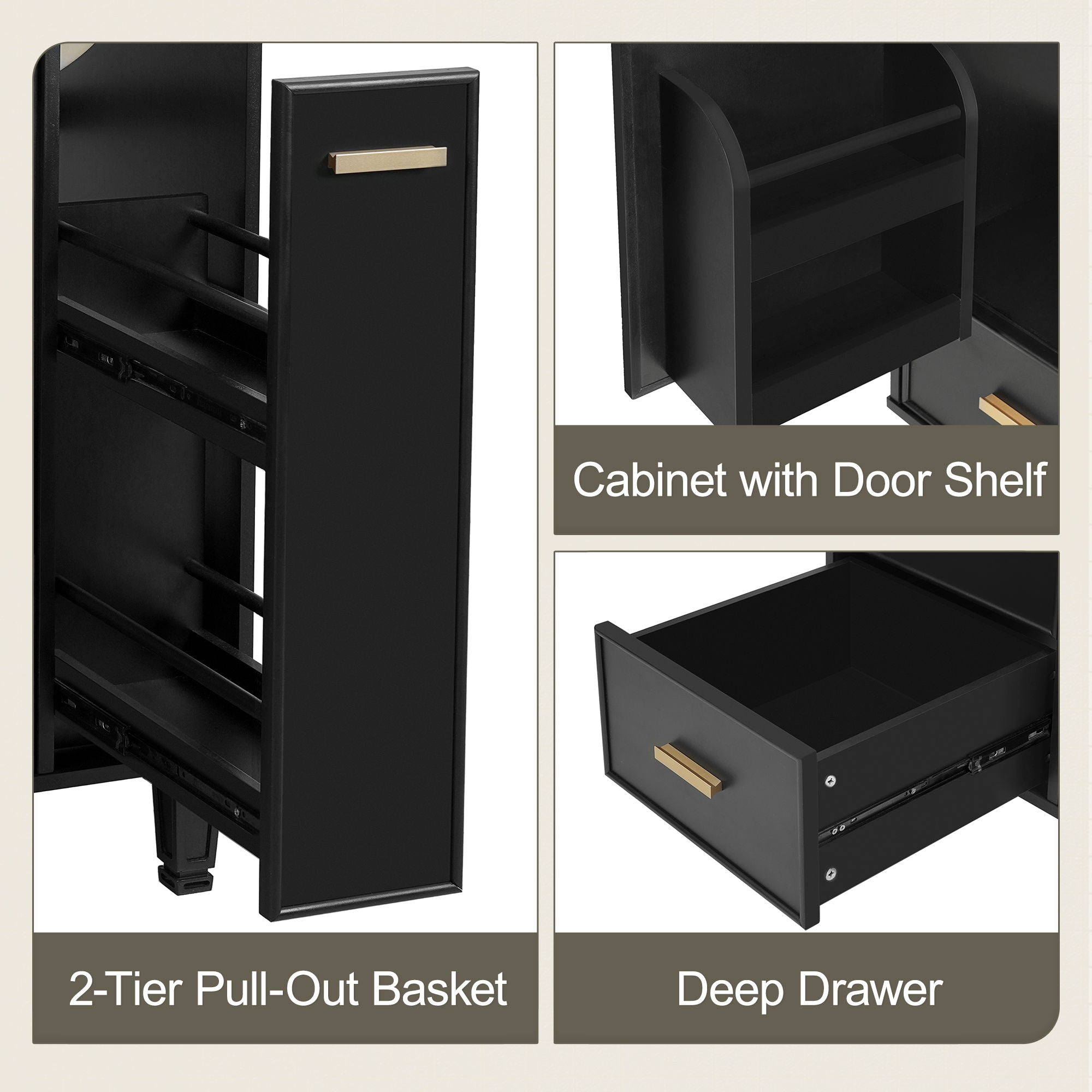 • Ample Storage Space: Includes a cabinet with door shelf, two-tier pull-out basket, and deep drawer for organized storage of bathroom essentials.