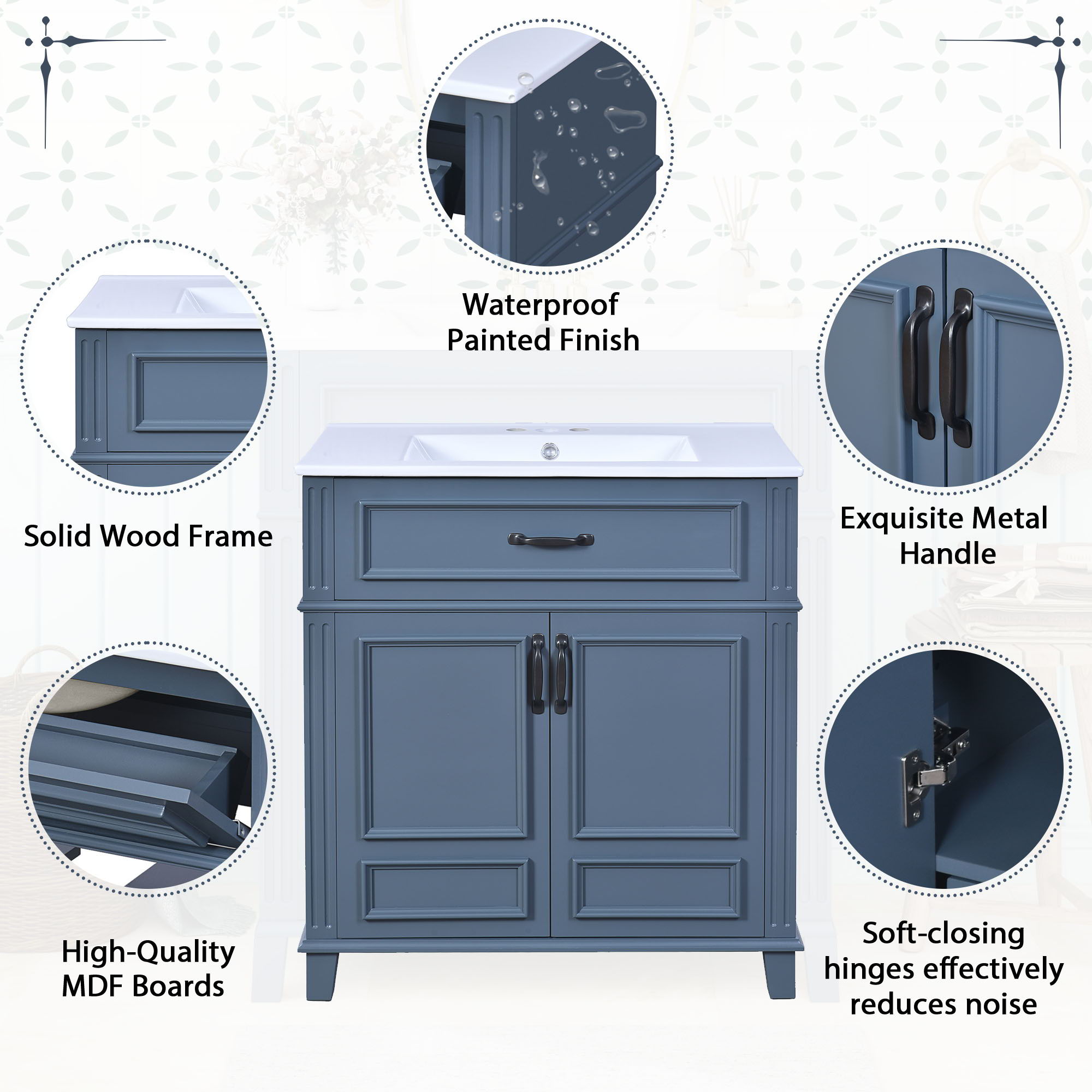 Solid Wood Frame: Durable and sturdy construction ensures long-term use and stability Ceramic Sink: Smooth, non-porous surface resists stains and...