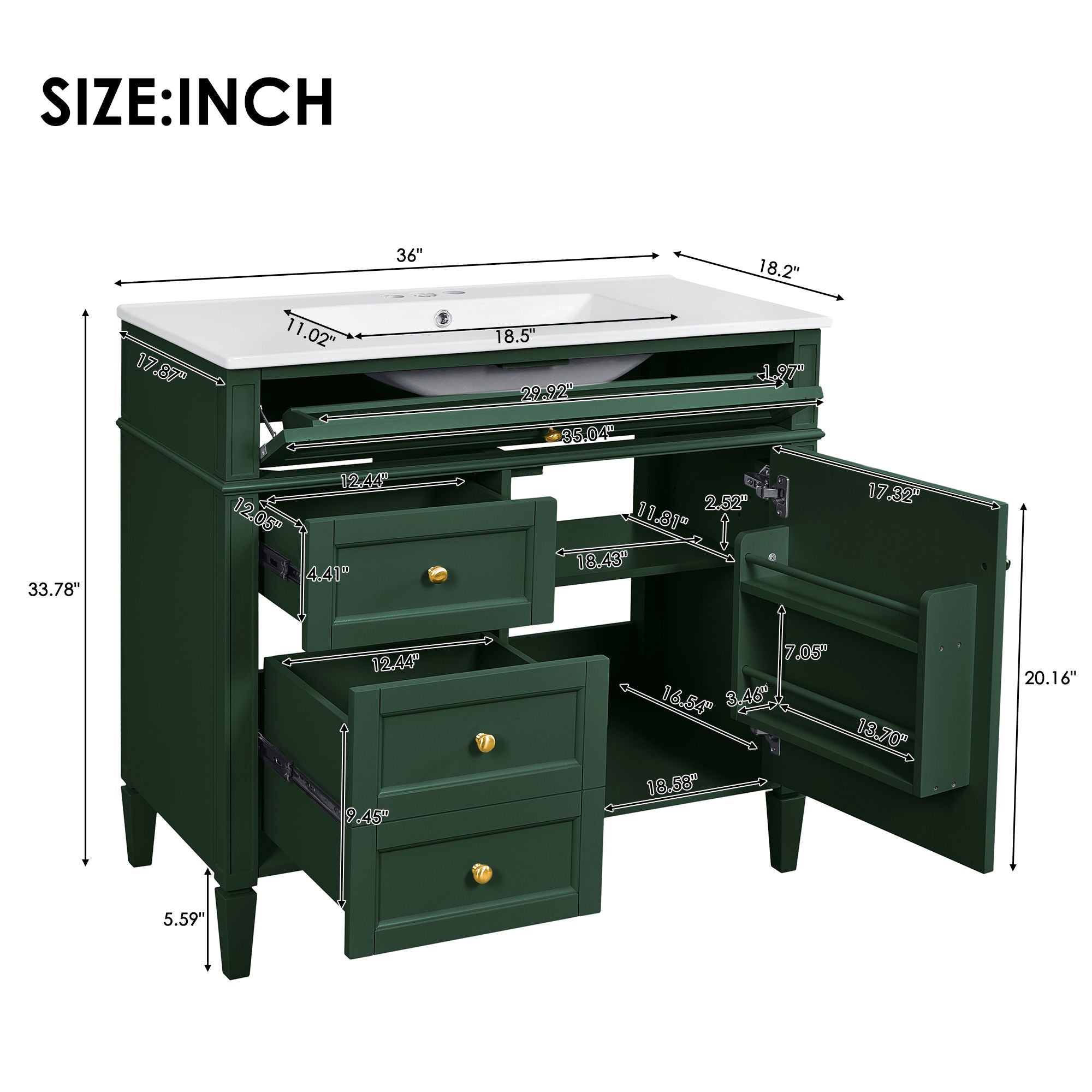 Bathroom Vanity With Top Sink, 2 Drawers And Tip Out Drawer, Rectangular Storage Cabinet - Garnet / Green36.0"W x 18.2"D x 33.78"H - 113.54 lb