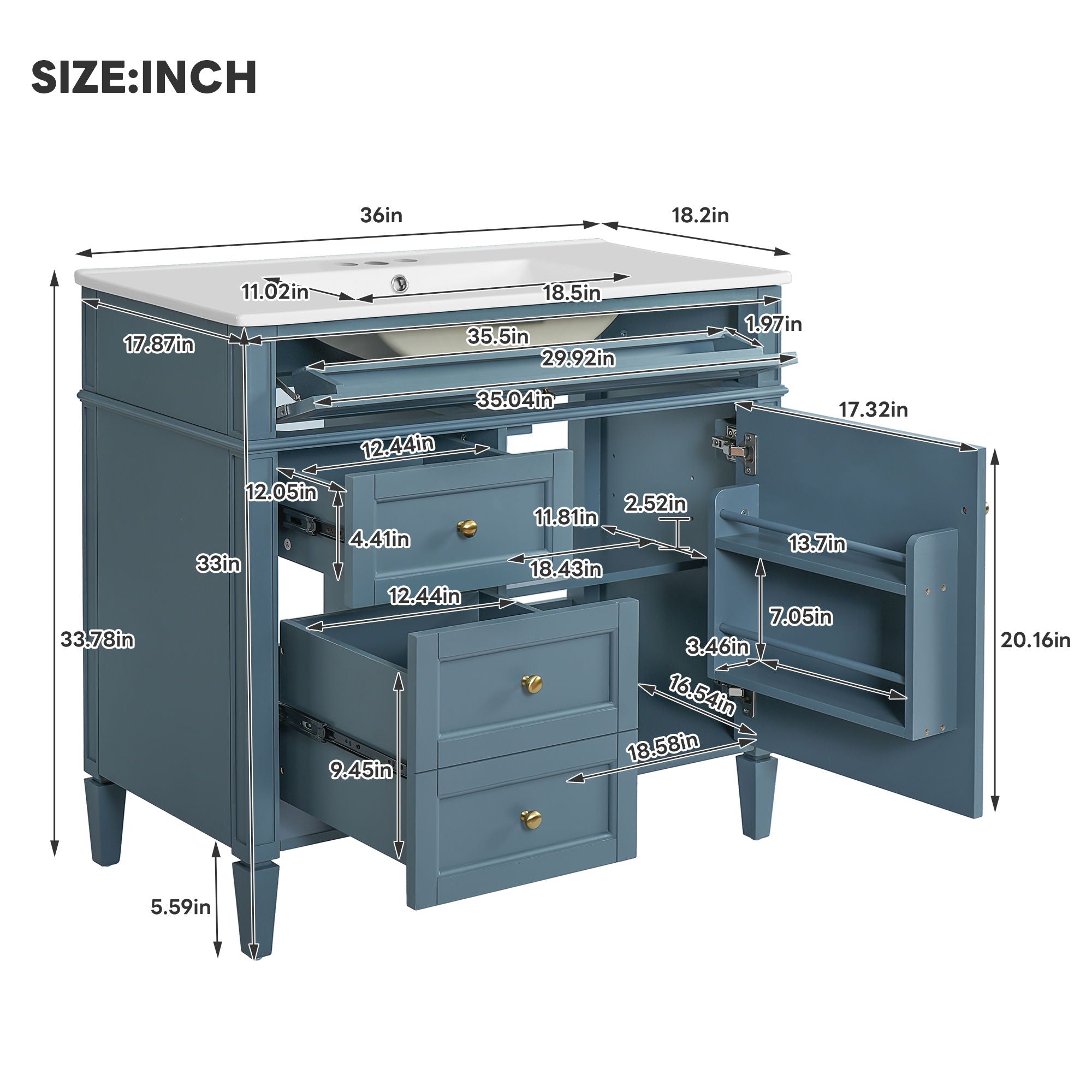 Bathroom Vanity With Top Sink, 2 Drawers And Tip Out Drawer - Indigo Blue36.0"W x 18.2"D x 33.78"H - 113.54 lb