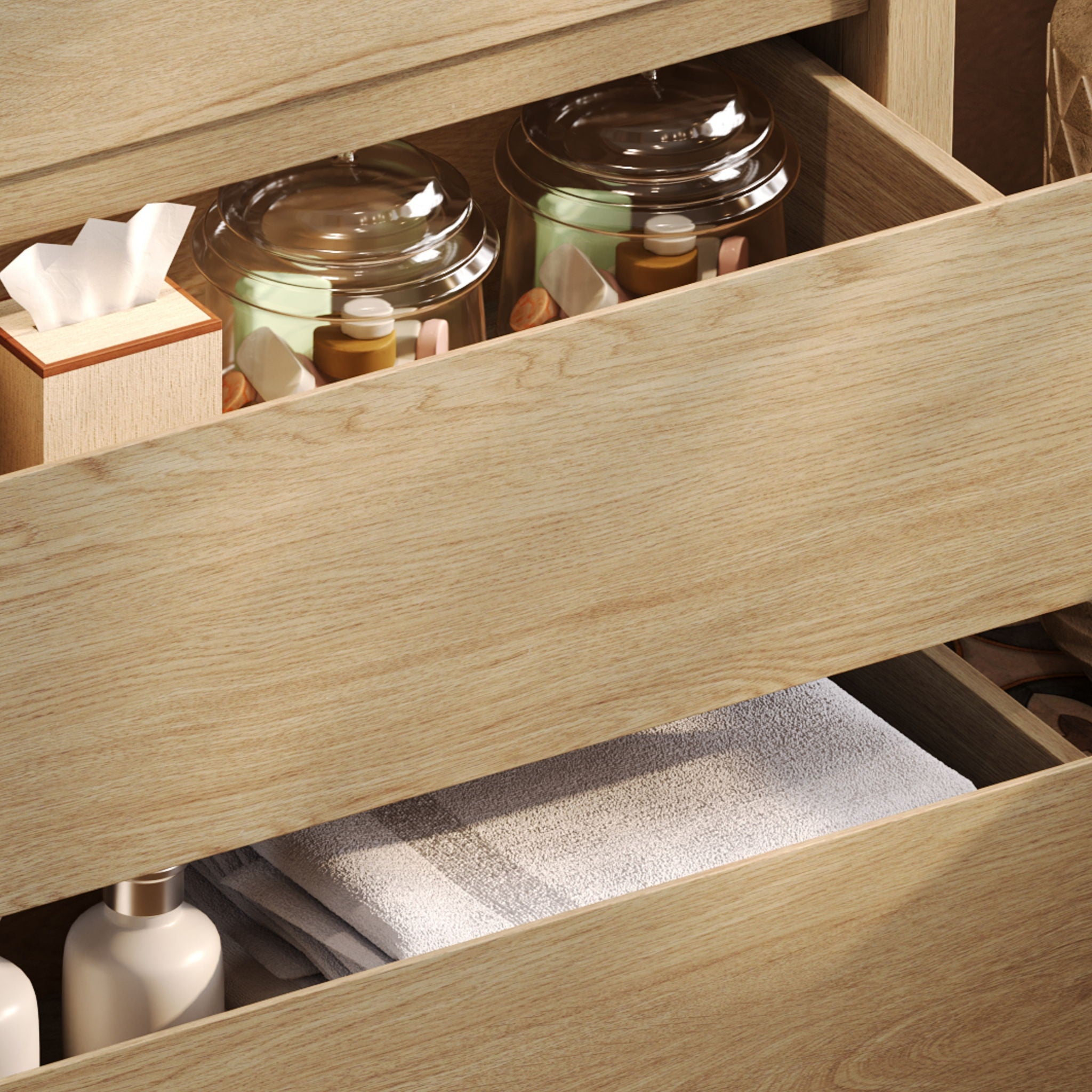 - Spacious Dual-Drawer Storage: 24.3" L x 13.5" W x 6.89" H dimensions accommodate tall bottles, towels, and daily essentials.