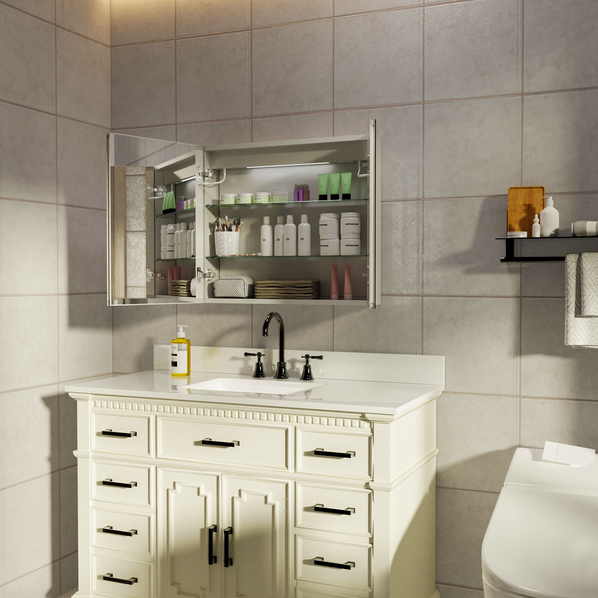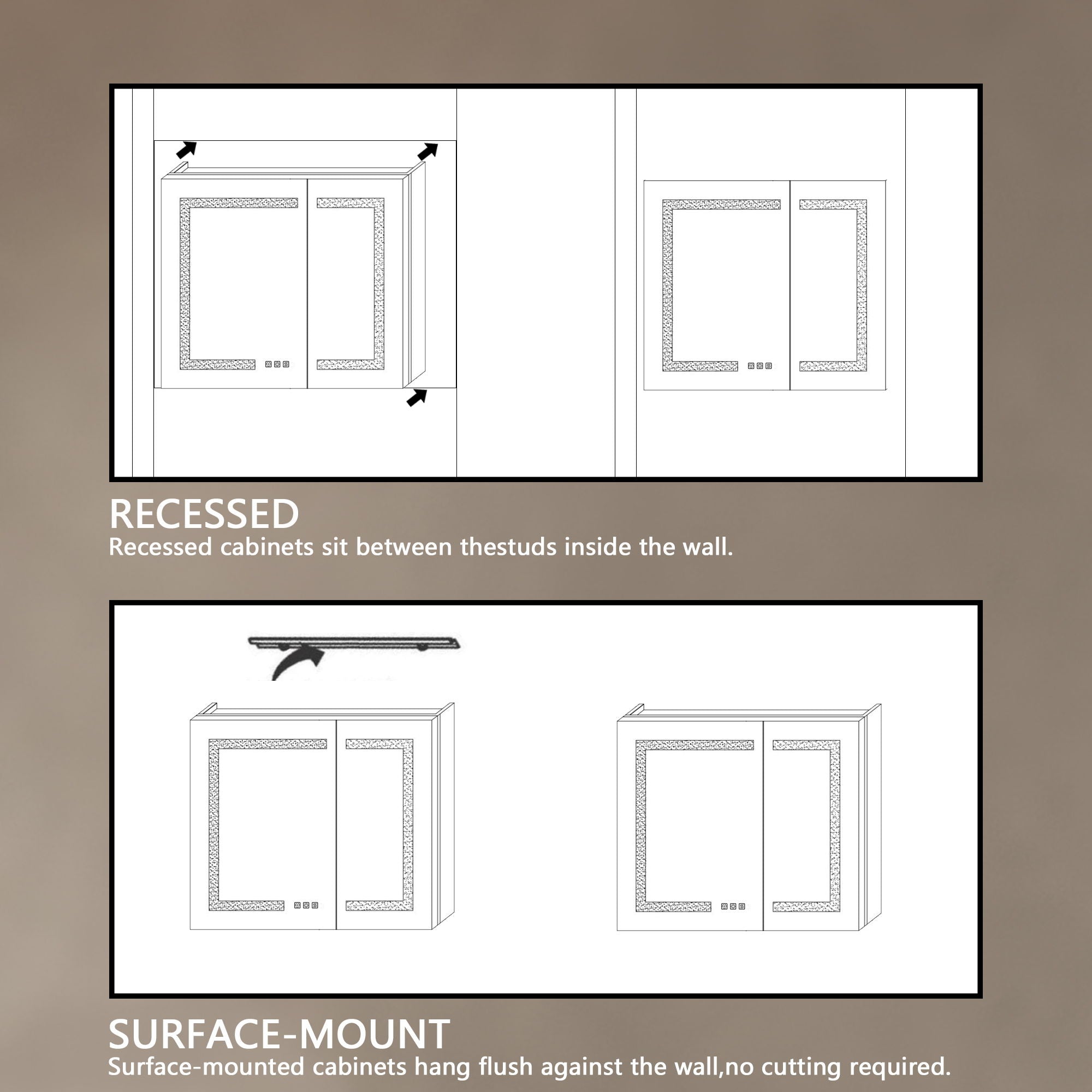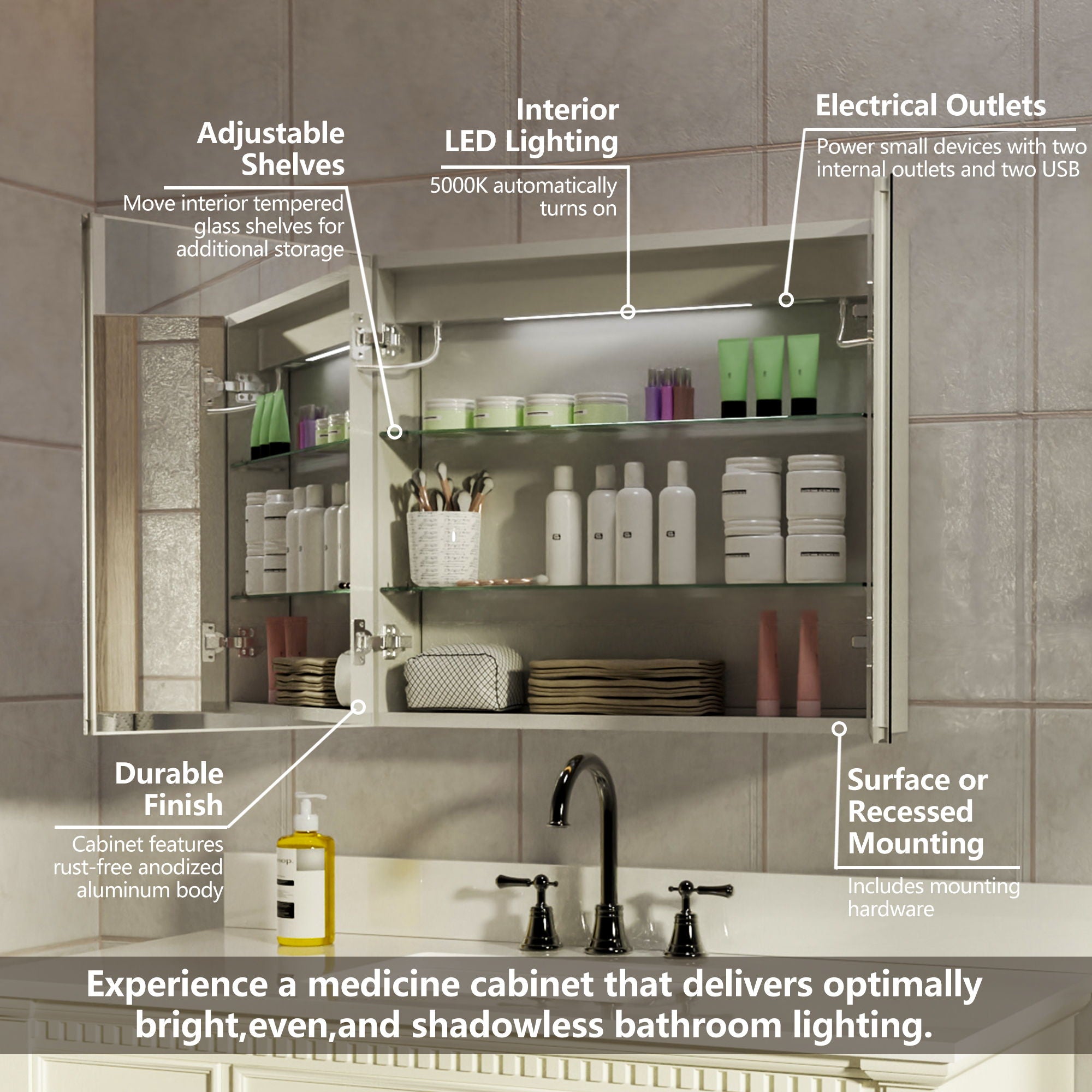 LED Lighted Bathroom Medicine Cabinet With Mirror, Recessed Or Surface LED Medicine Cabinet, Defog, Stepless Dimming, Color Temper Change, Storage Shelves