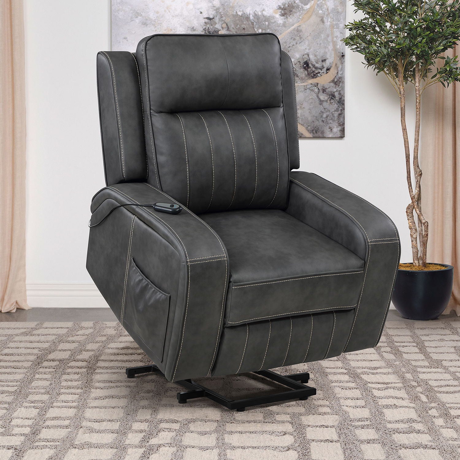 Transitional Design: Wide track arms and soft grey leatherette upholstery create a refined, supportive appearance Remote-Controlled Operation: Smooth power lift...