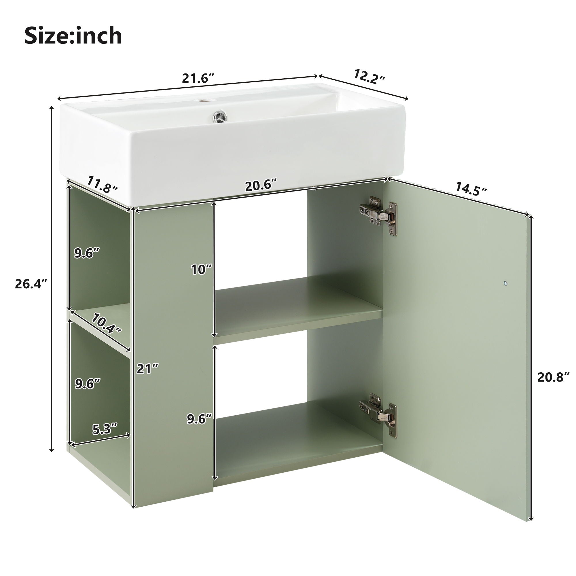 Modern Floating Bathroom Vanity With Ceramic Basin, Perfect For Small Bathrooms, Left Side Storage - Green12.2"W x 21.6"D x 26.4"H - 48.39 lb