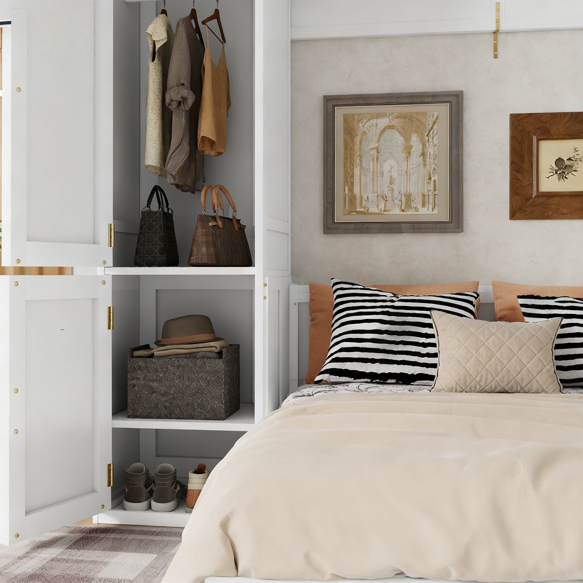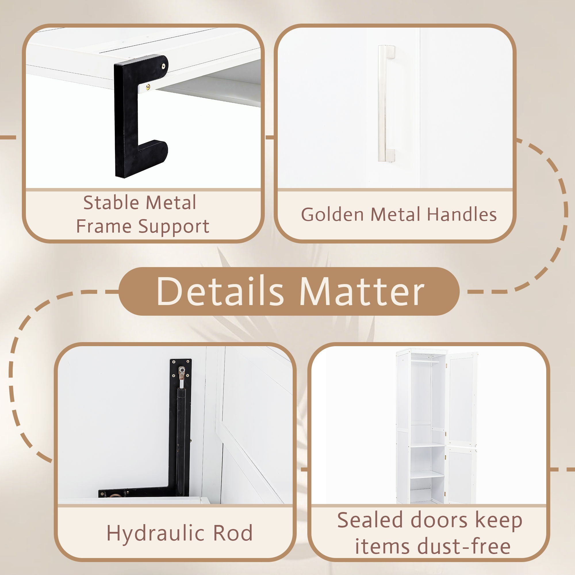 Queen Size Murphy Bed With Wardrobe, Space-Saving Hidden Wall Bed With Desk And Charging Station - White