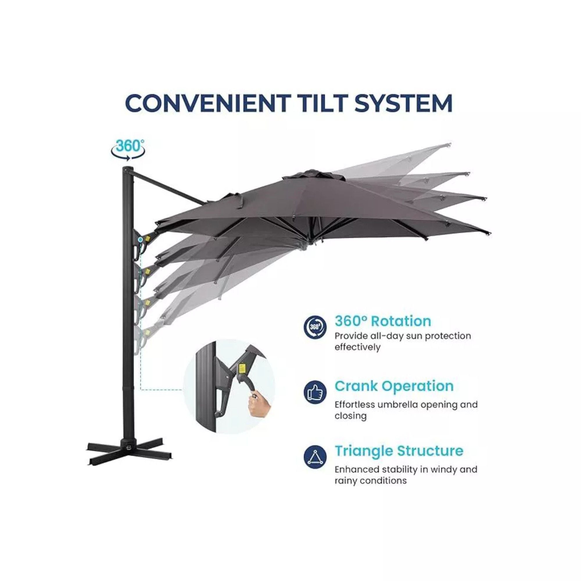 • 360° Rotation & Infinite Tilt: Smooth foot pedal and crank handle enable full horizontal movement and adjustable angle for continuous shade as the sun shifts.